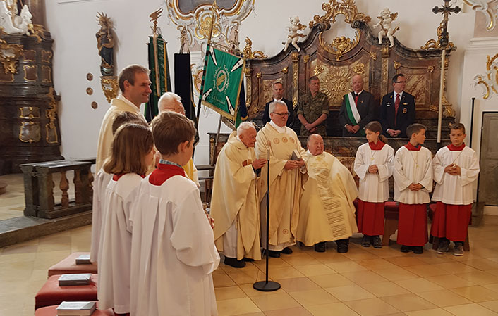 und Fahnenabordnung an der Gedenkveranstaltung. Dem Gottesdienst, zelebriert von Stadtpfarrer Christoph Hänsler, folgte eine Andacht am restaurierten Regimentsdenkmal an der Südseite der Basilika St. Ulrich.